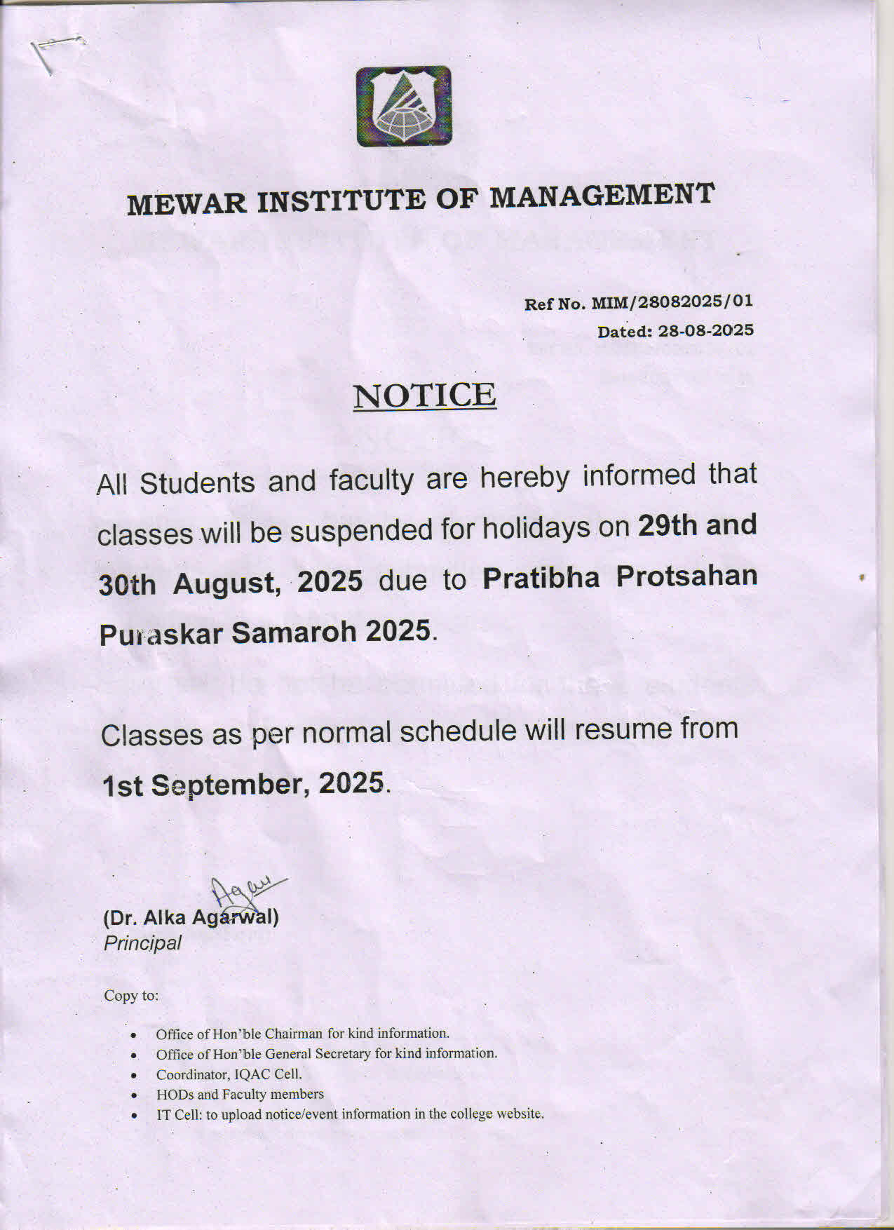 28-08-2025 Classes will be suspended for holidays on 29th & 30th August, 2025 due to Pratibha Protsahan Puraskar Samaroh 2025 View PDF