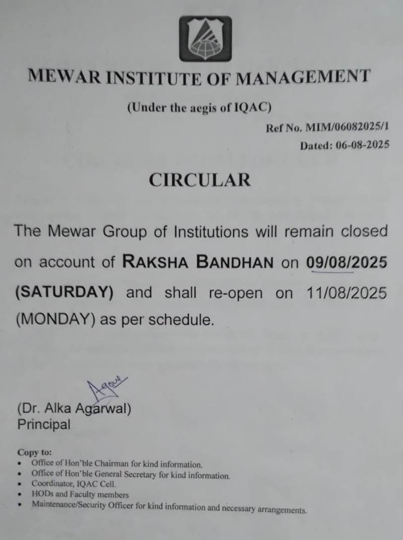 06-08-2025 Institute will remain Closed on account of Raksha Bandhan on 09 August 2025 . View PDF