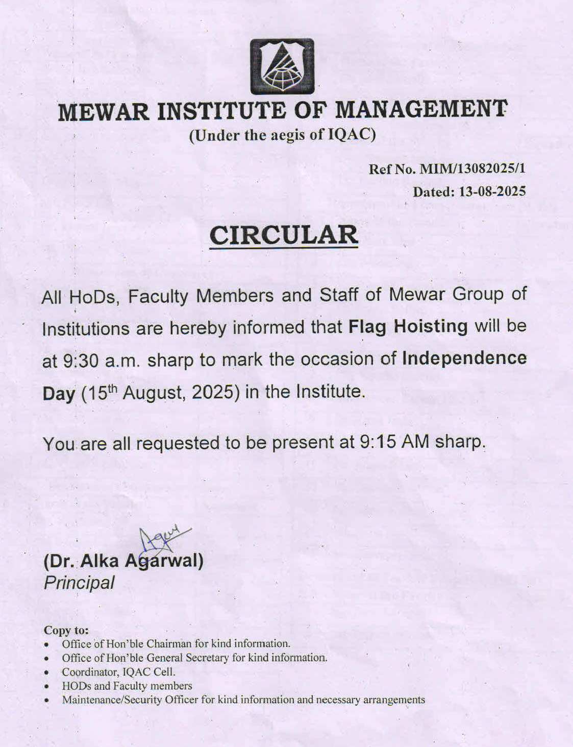 13-08-2025 Institute are hereby informed that Flag Hosting will be 15th August 2025 at 9:30 AM occasion of Independence Day. View PDF