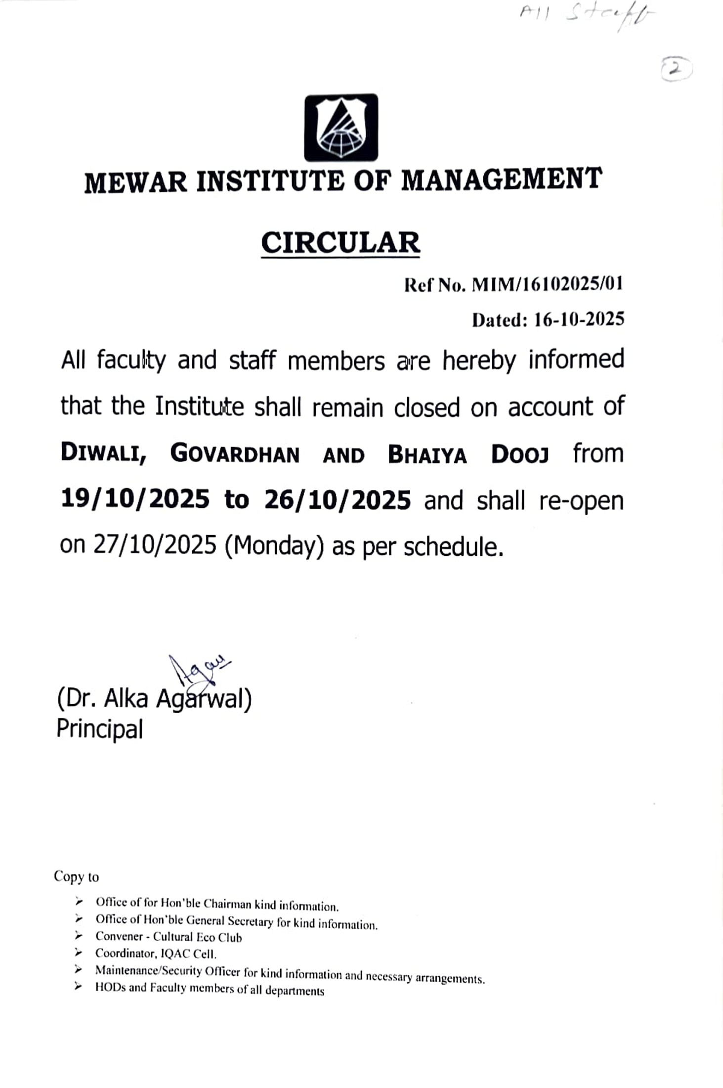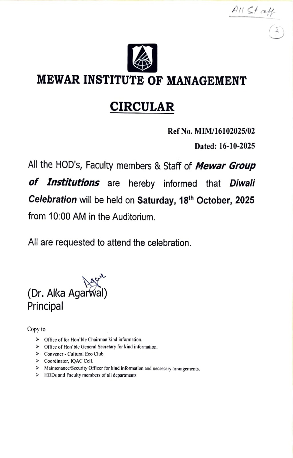 16-10-2025 All the HOD's, Faculty members & Staff hereby informed that Diwali Celebration will be held on 18th October,2025 from 10:00 AM in the Auditorium. View PDF