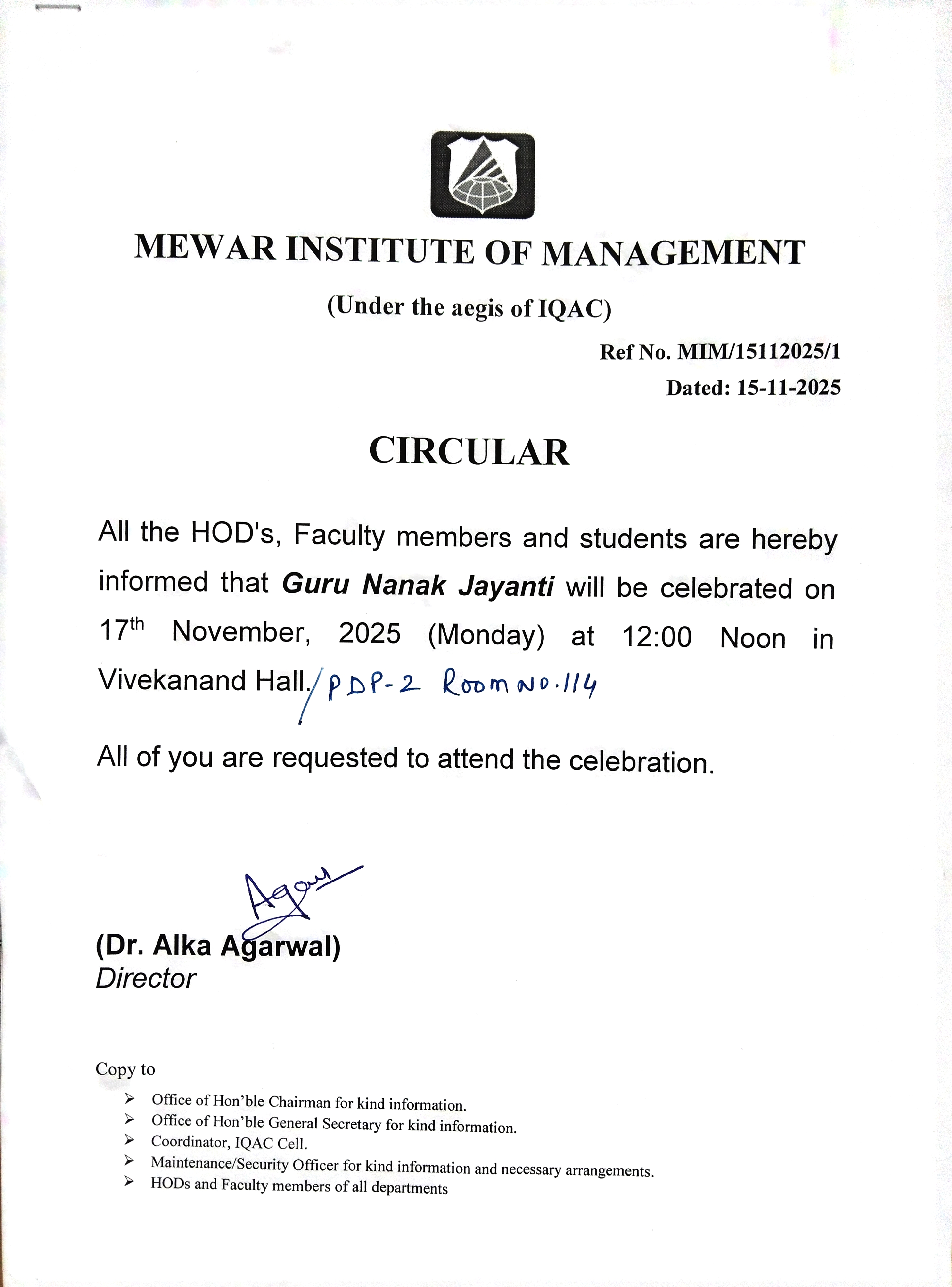 15-11-2025 All the HOD's, Faculty members and students are hereby informed that Guru Nanak Jayanti will be celebrated on 17th November, 2025 at 12:00 Noon in Vivekanand Hall requested to attend the celebration. View PDF