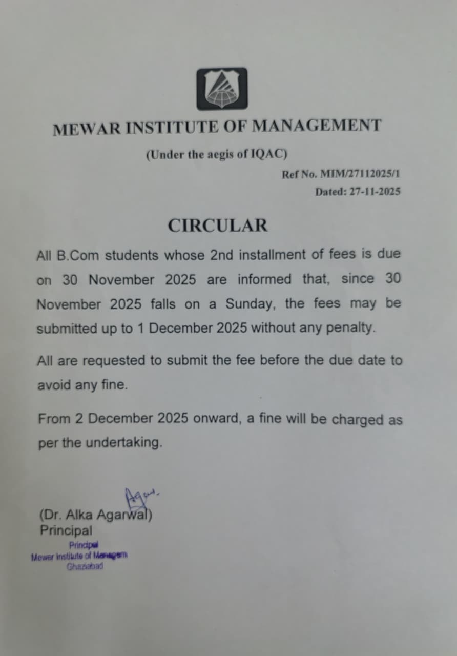 27-11-2025 All B.Com students whose 2nd installment of fees is due on 30 November 2025 are informed that, since 30 November 2025 falls on a Sunday, the fees may be submitted up to 1 December 2025 without any penalty.. View PDF