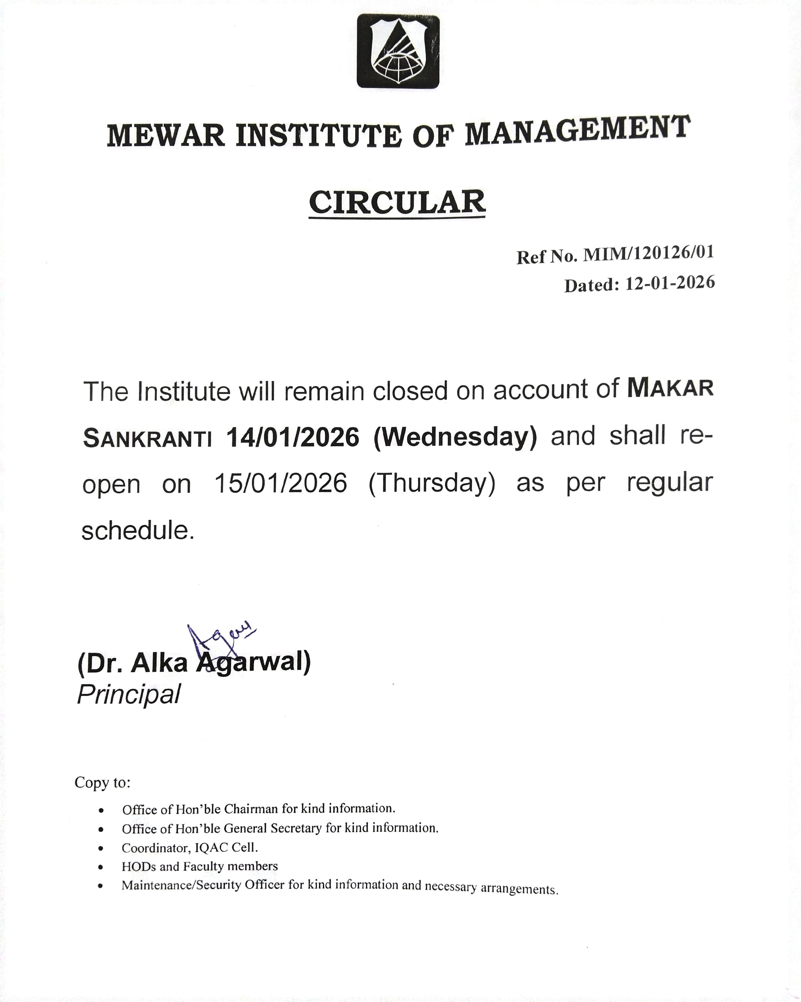 12-01-2026 The Institute will remain closed on account of MAKAR SANKRANTI 14/01/2026 and shall reopen on 15/01/2026 as per regular schedule. View PDF