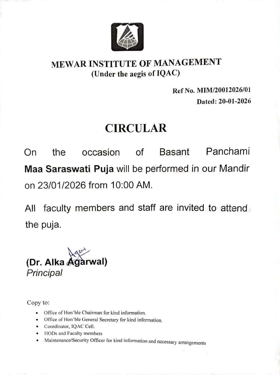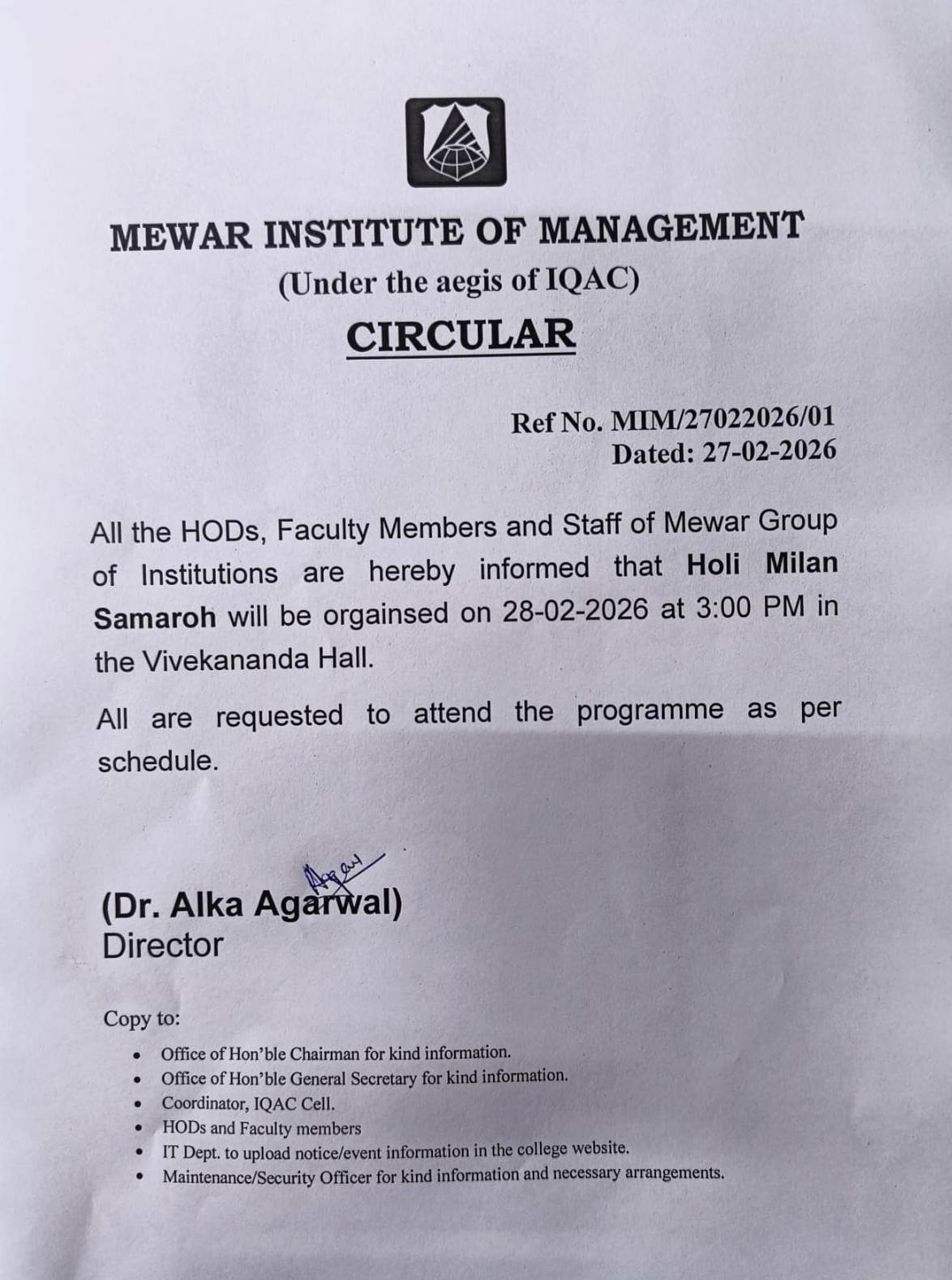 27-02-2026 All the HODs, Faculty Members and Staff of Mewar Group of Institutions are hereby informed that Holi Milan Samaroh will be organized on 28-02-2026 at 3:00 PM in the Vivekananda Hall .All are requested to attend the Programme as per schedule. View PDF