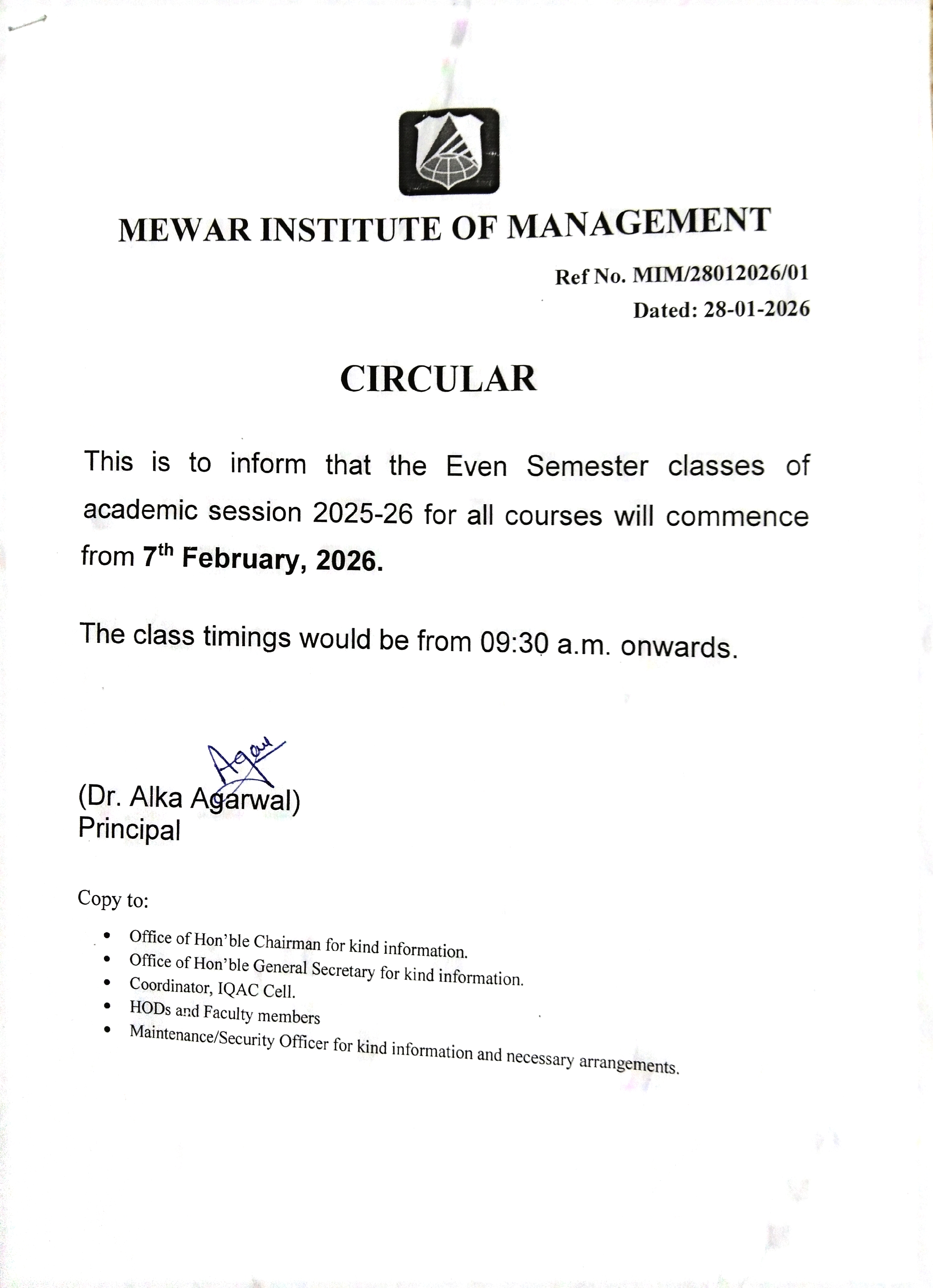 28-01-2026 This is to inform that the Even Semester classes of academic session 2025-26 for all courses will commence from 7th February, 2026. The class timings would be 09:30 a.m. onwards. View PDF