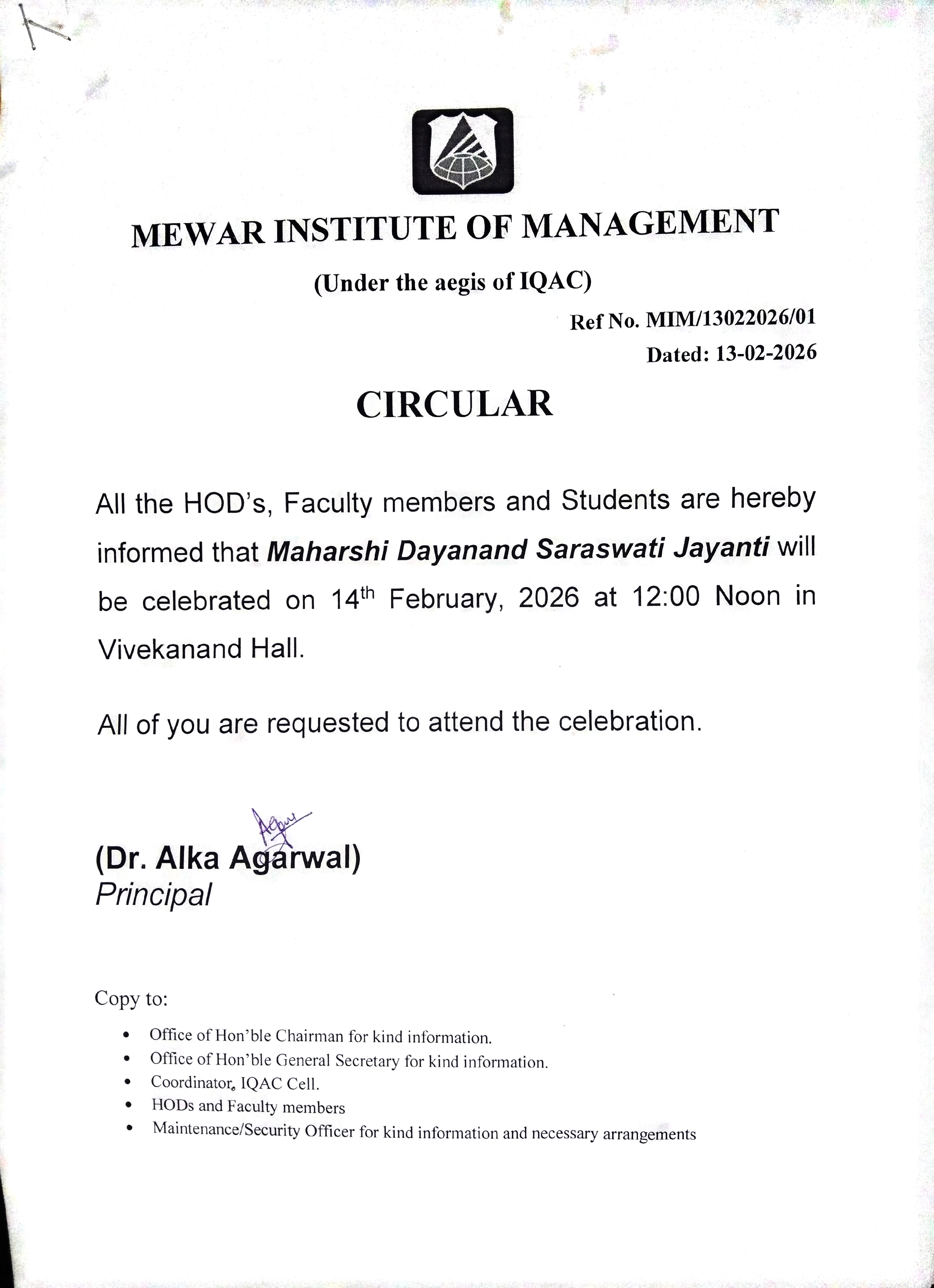 13-02-2026 All the HOD's, Faculty members and Students are hereby informed that Maharshi Dayanand Saraswati Jayanti will be celebrated on 14th February, 2026 at 12:00 Noon in Vivekanand Hall. View PDF