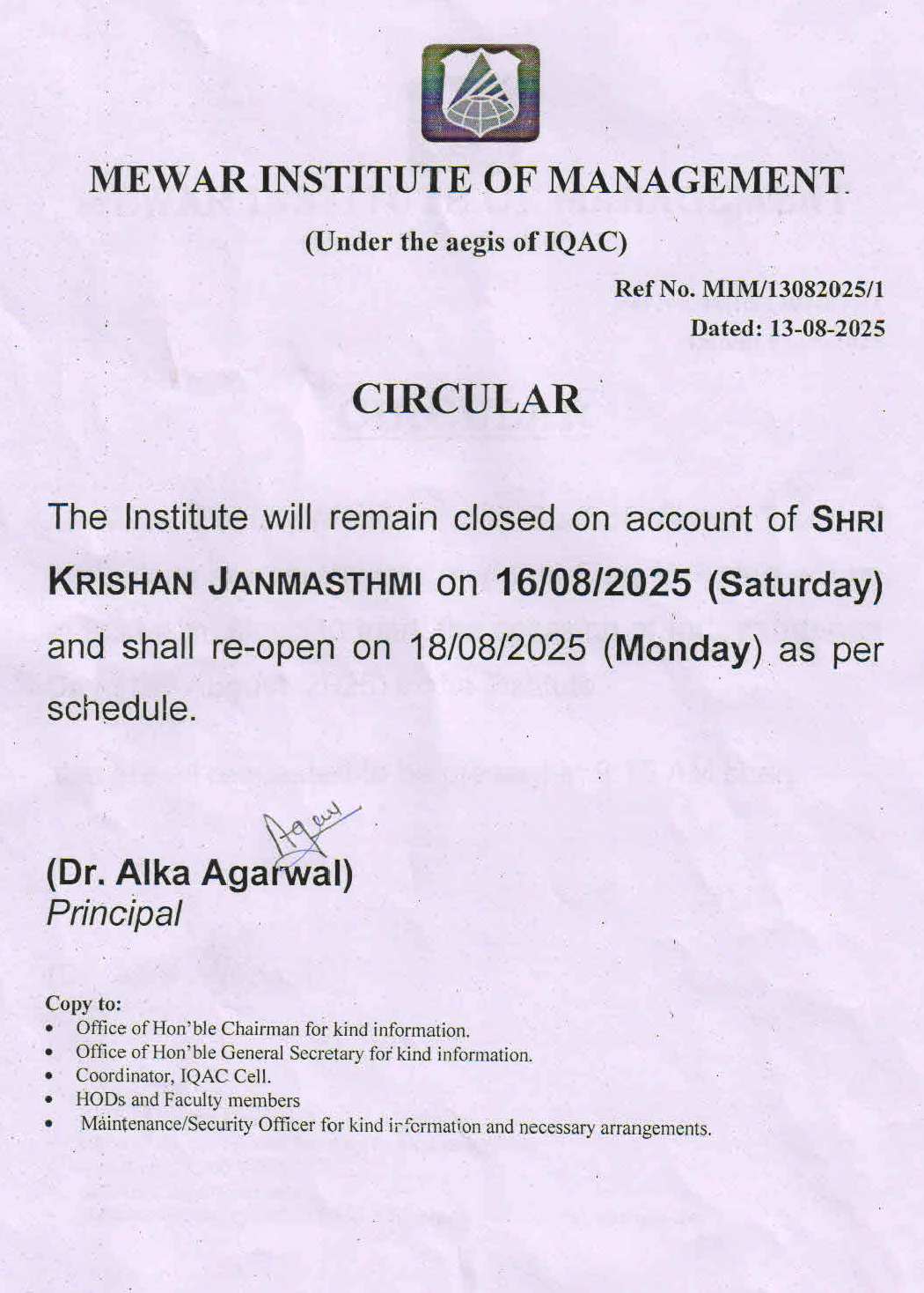 13-08-2025 Institute will remain closed on account of Shri Krishan Janmasthmi. on 16 August 2025 . View PDF