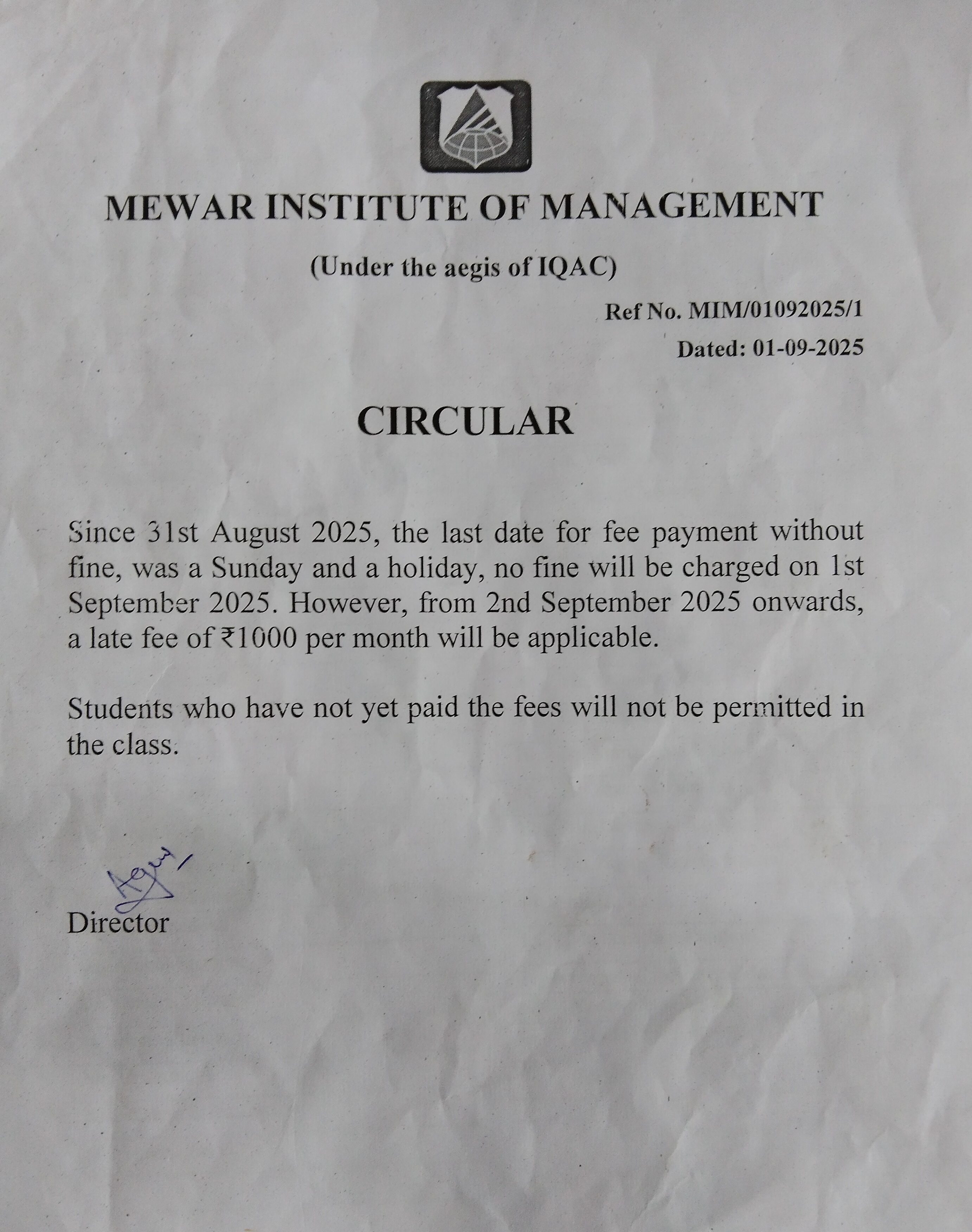 01-09-2025 Since 31st August 2025, the last date for fee payment without fine, View PDF