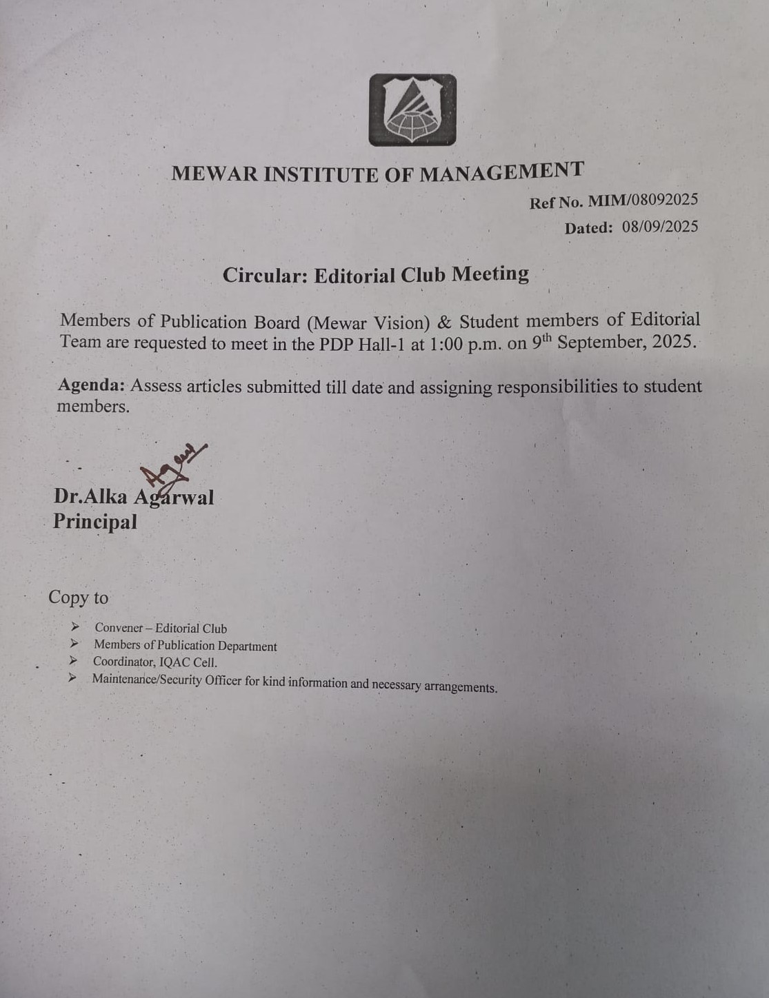 08-09-2025 Member of Publication & Editorial Board Mewar Vision meet in PDP-I 1:00 PM on 09th September, 2025. View PDF