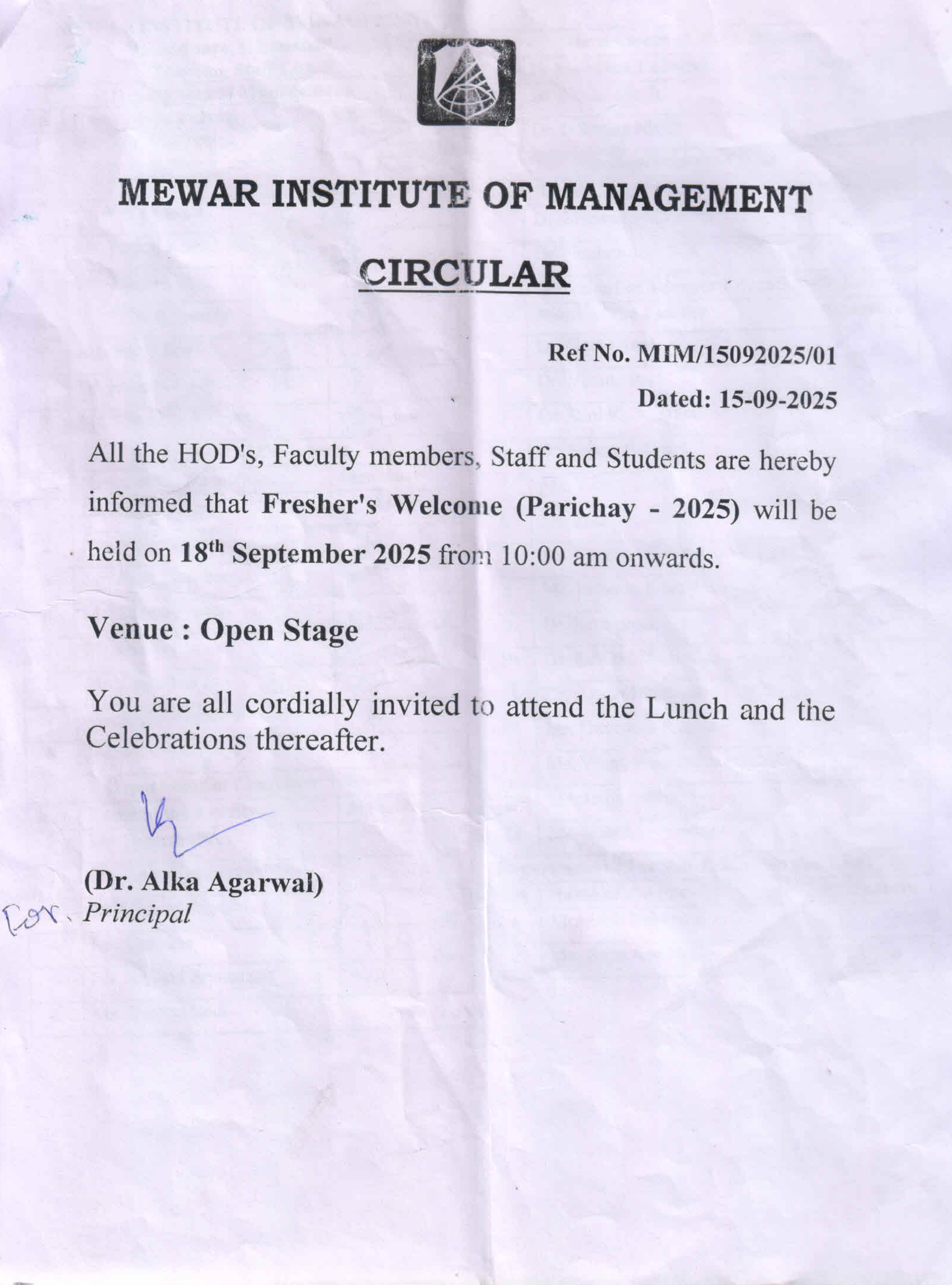 15-09-2025 All the HOD's, Faculty ,Staff and Students are hereby informed that Fresher's Welcome (Parichay - 2025) will be held on 18th September 2025 from 10:00 am onwards. View PDF