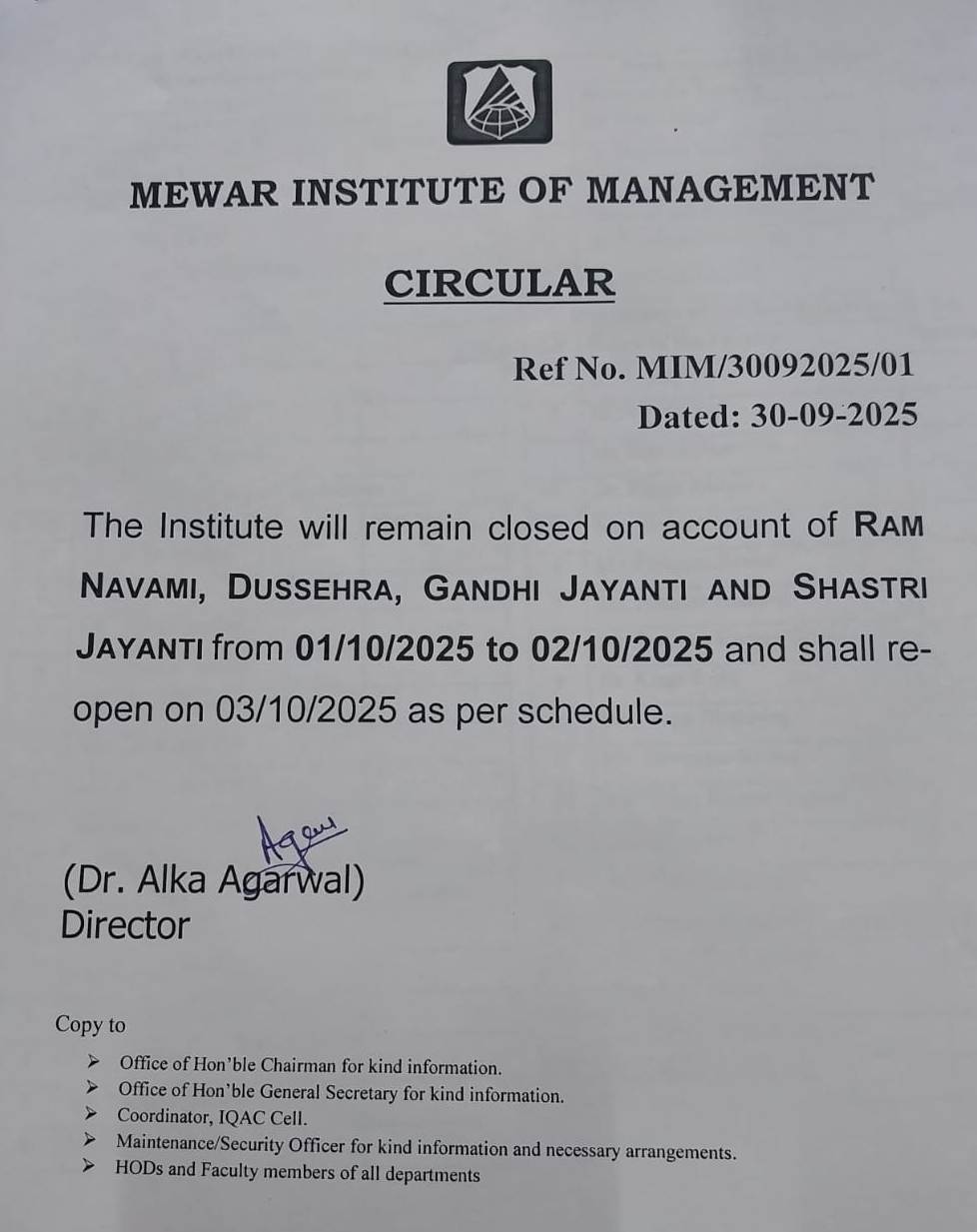 30-09-2025 Institute will remain closed on account of Ram Navami, Dussehra, Gandhi Jayanti from 01-10-2025 to 02-10-2025 View PDF