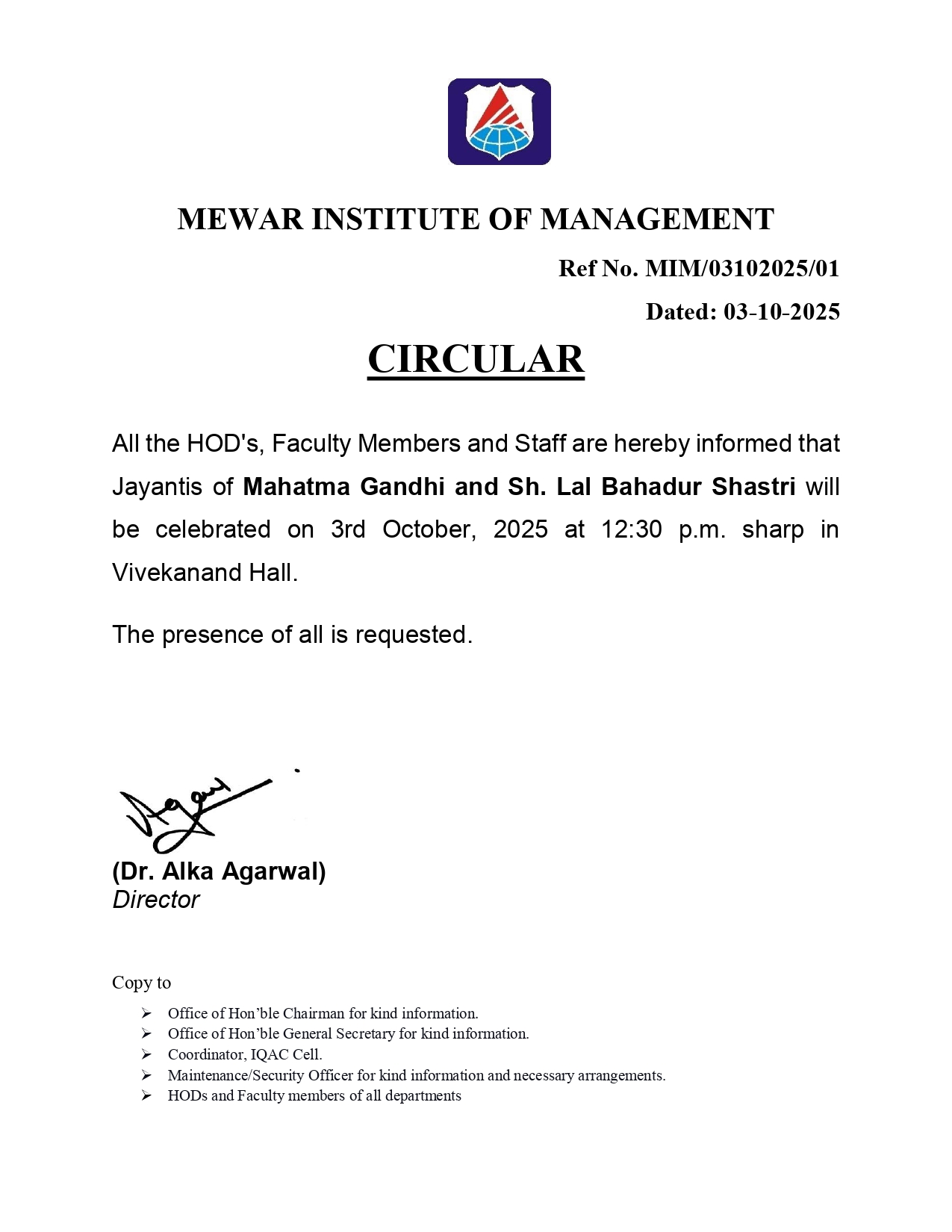 03-10-2025 Jayanti of Mahatma Gandhi and Sh. Lal Bahadur Shastri will be celebrated on 3rd October 2025 AT 12:30 p.m. in Vivekananda Hall. View PDF