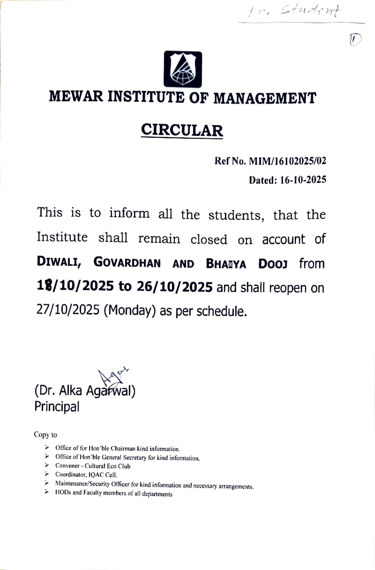 16-10-2025 All the HOD's, Faculty members & Staff hereby informed that Diwali Celebration will be held on 18th October,2025 from 10:00 AM in the Auditorium. View PDF