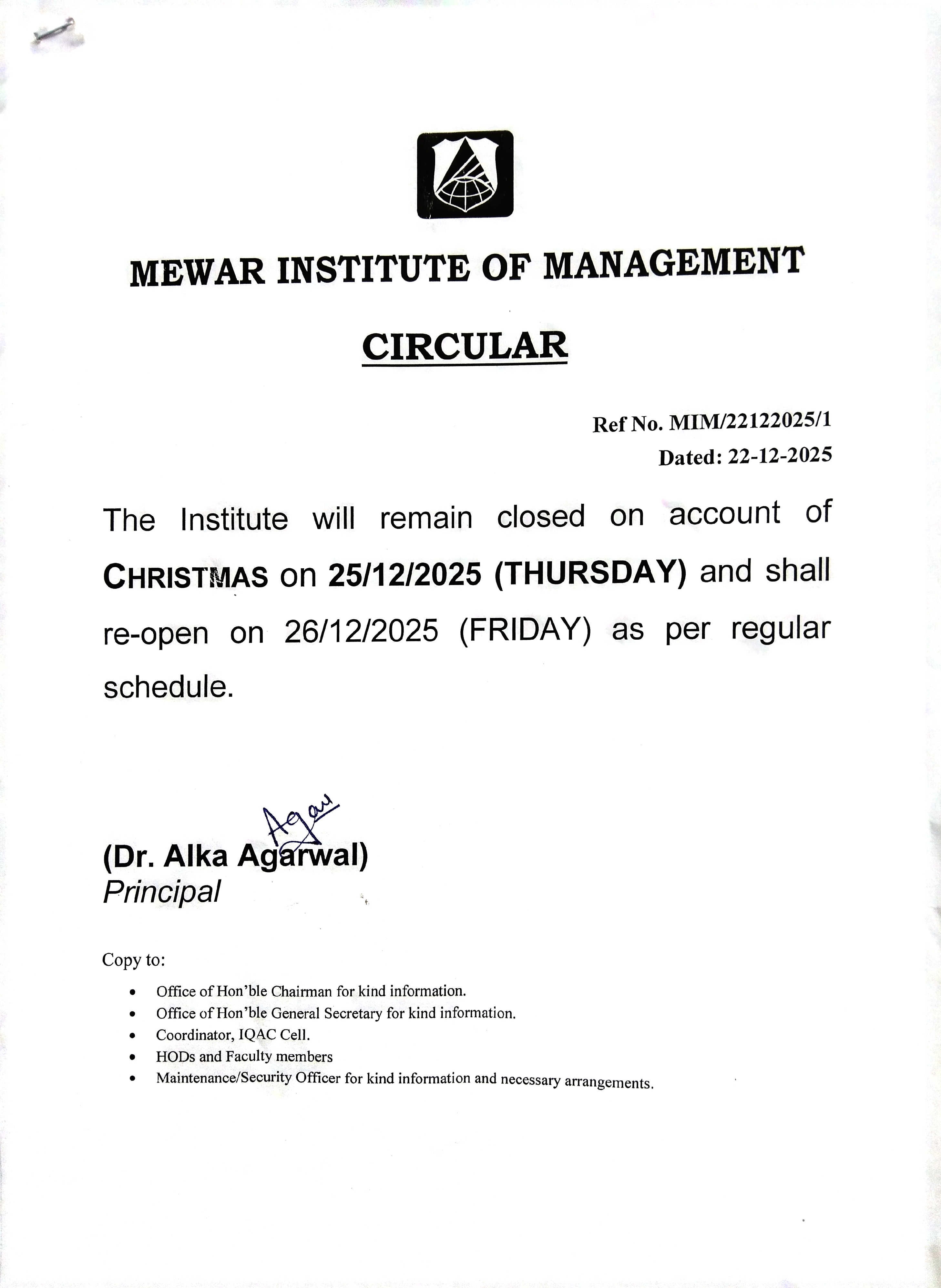 22-12-2025 Institute will remain closed on account of CHRISTMAS on 25/12/2025 and shall re-open on 26/12/2025 as per regular schedule View PDF