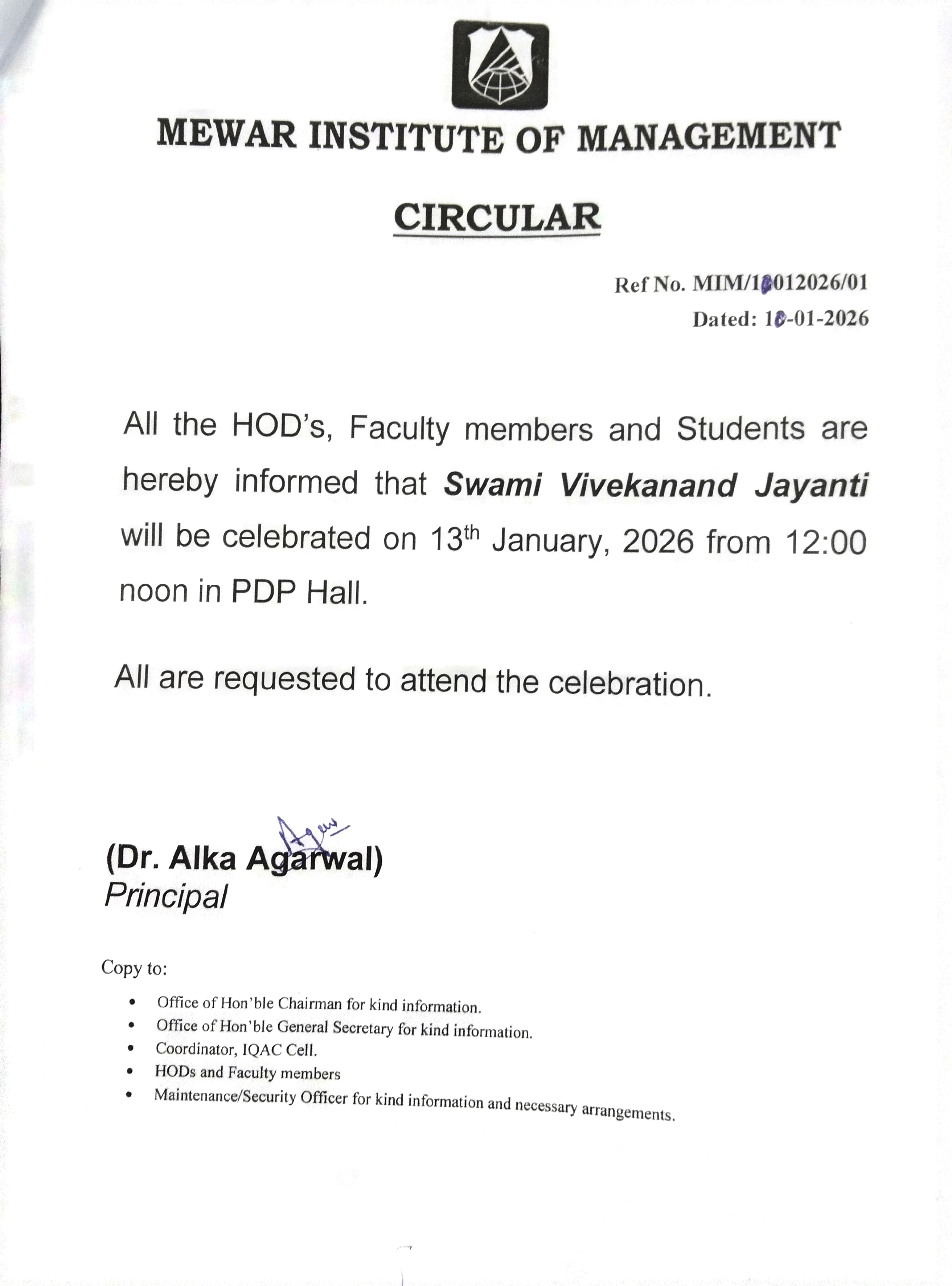 10-01-2026 All HOD's, Faculty members and Students are hereby informed that Swami Vivekanand Jayanti will be celebrated on 13th January, 2026 from 12:00 noon in PDP Hall. View PDF
