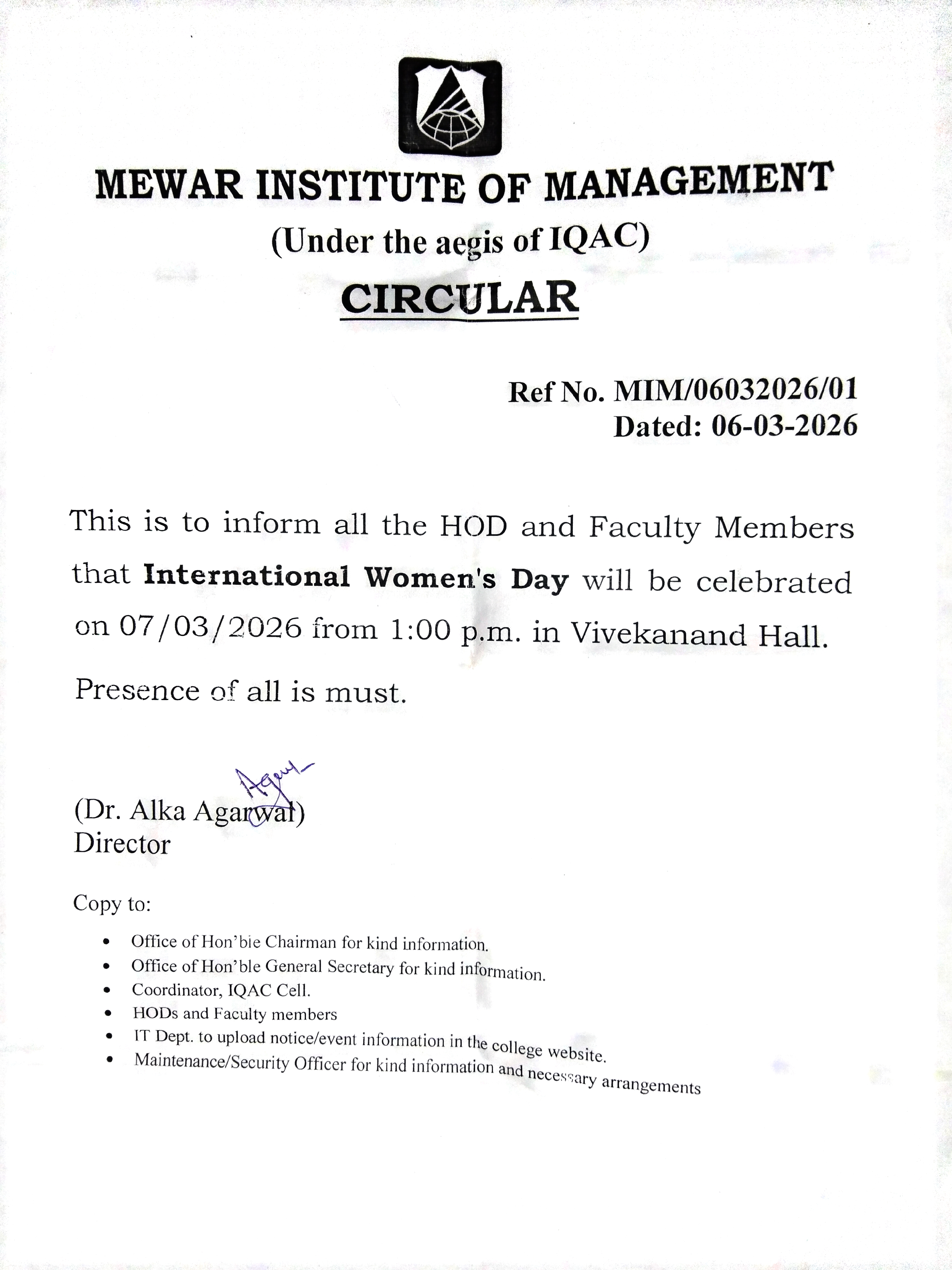 06-03-2026 This is to inform all the HOD and Faculty Members that International women's Day will be celebrated on 07/03/2026 from 1:00 p.m. in Vivekanand Hall. View PDF