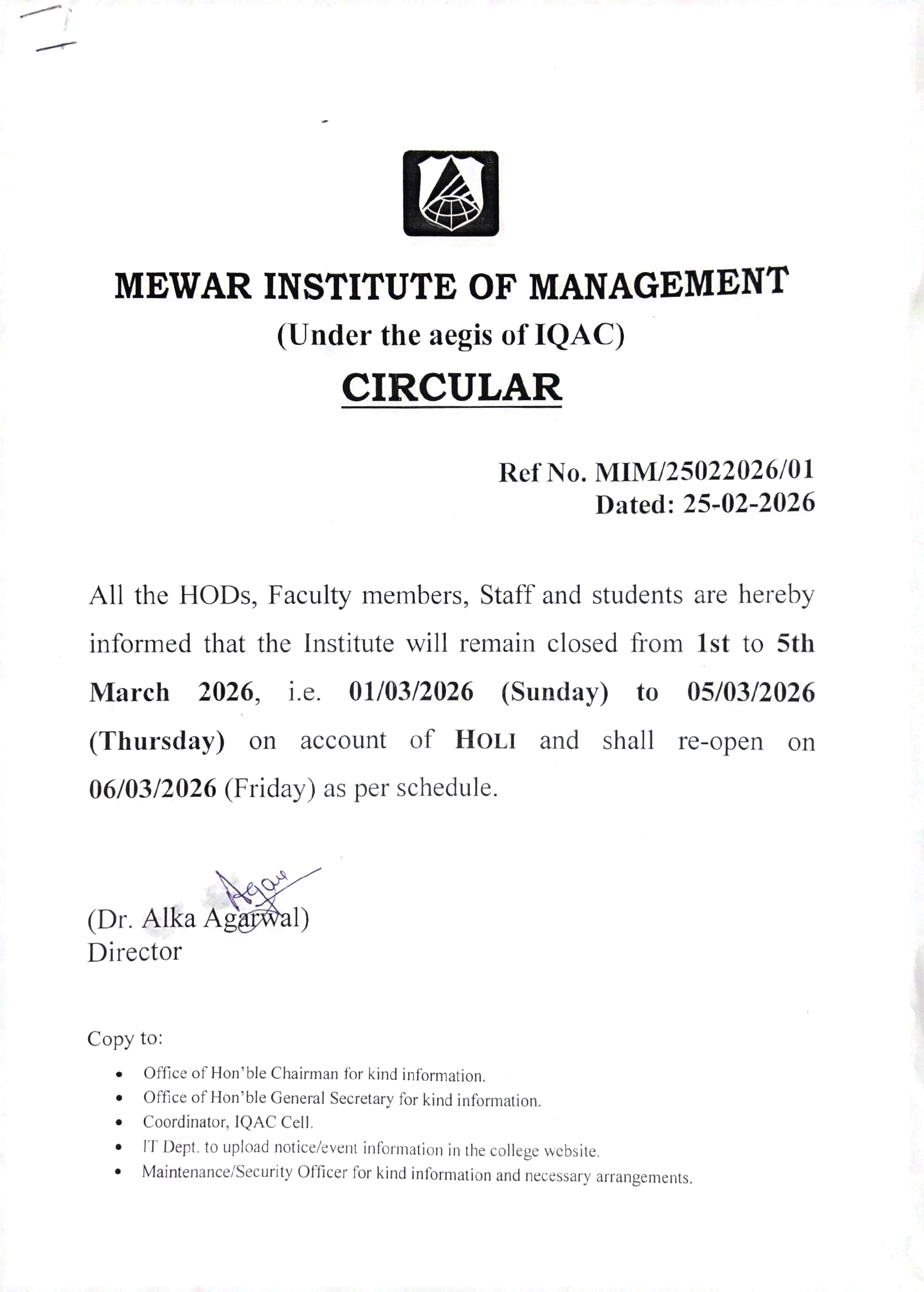 25-02-2026 All the HODs, Faculty members, Staff and students are informed the Institute will remain closed from 1st to 5th March 2026, i.e. 01/03/2026 to 05/03/2026 on account of HOLI and shall re-open on 06/03/2026as per schedule. View PDF
